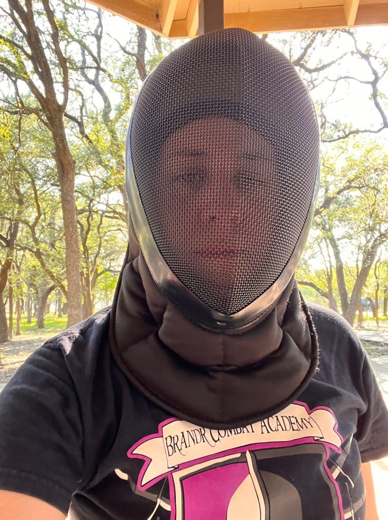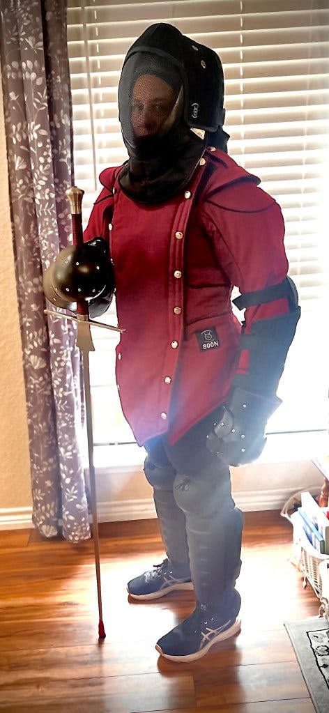 The fencing helmet had made me appear a little taller. The light made me seem a little thinner. The bulk of the jacket conveyed the strength and power of Xena. The sword in my hands had the flavor of Eowyn. Perhaps the jacket wasn't so bad or perhaps it didn't actually matter all that much. For my family, I was already that fabulously elegant sword fighter of my imagination, and the jacket fit. That was enough.