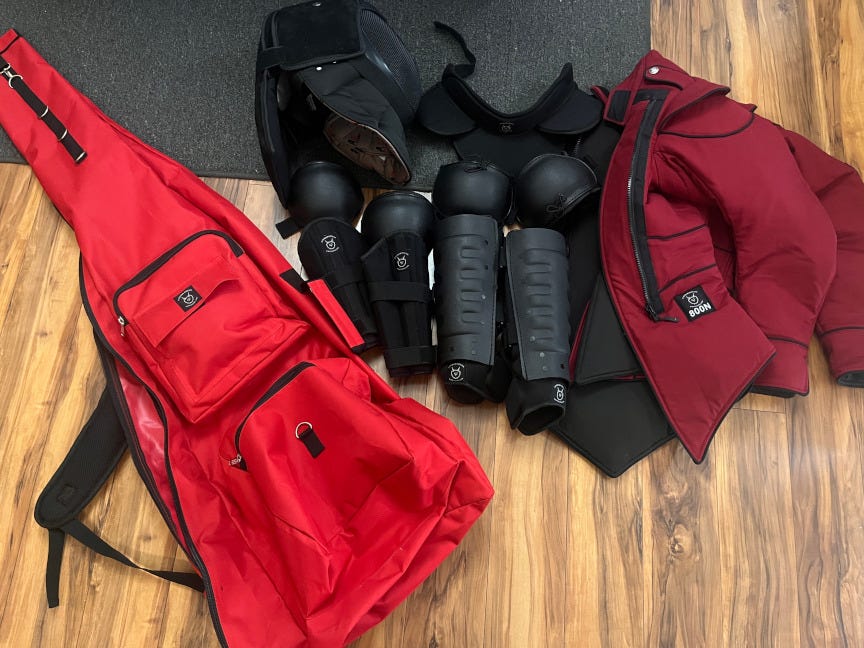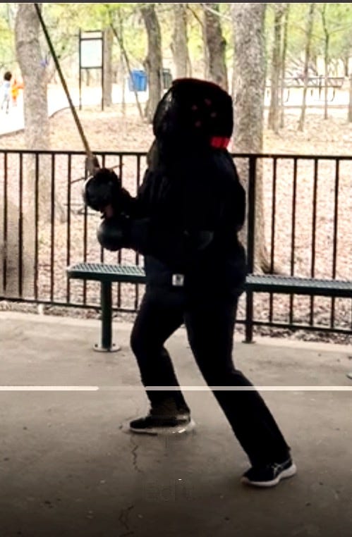 I ordered my helmet, staff, and gloves from Purple Heart Armory, one giddy piece at a time, like a small child finally getting the toy they wanted for Christmas. I'll write a review for Purple Heart later. This equipment allowed me to awkwardly do certain kinds of drills at the club practices with all the enthusiasm of a distracted puppy.