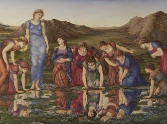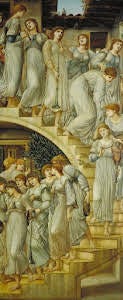 Two good examples of this development are The Mirror of Venus (fig. 1) and The Golden Stairs (Fig. 2). These two pieces were not based on any particular subject or story, but seem like something from some far-off place. They were both original ideas that came from Burne-Jones's imagination. They are an illustration of an idea, feeling, and dream in one. The Mirror of Venus (fig. 1) is a melancholy piece that evokes some introspective thought. The nostalgia that is portrayed seems to be looking to the past for better days. Venus and her maidens seem to be looking in the pond, yet beyond it at the same time. The rocky arid landscape that is seen in the background of this work is commonly copied by all of Burne-Jones’s followers. This was one of the pieces in an exhibit at the Grosvenor Gallery in 1877 that made him famous overnight.