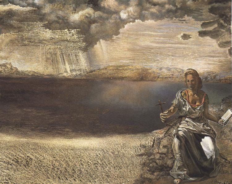Dali immersed himself in this world of Symbolism. He even created surrealist objects for window displays and designed surrealist hats. He thrived on the publicity and controversy that his artwork created. Later in life, though, he began to explore themes that seemed to show some Pre-Raphaelite philosophy. He started to paint things that were more spiritual and centered on the beauty of his wife, Gala. An example of this could be Saint Helena of Port Lligat (fig. 9). In this piece, he depicts his wife as the mother of Constantine the Great. He had shifted his pessimistic dream world into a realm more akin to the Pre-Raphaelites’ dream.