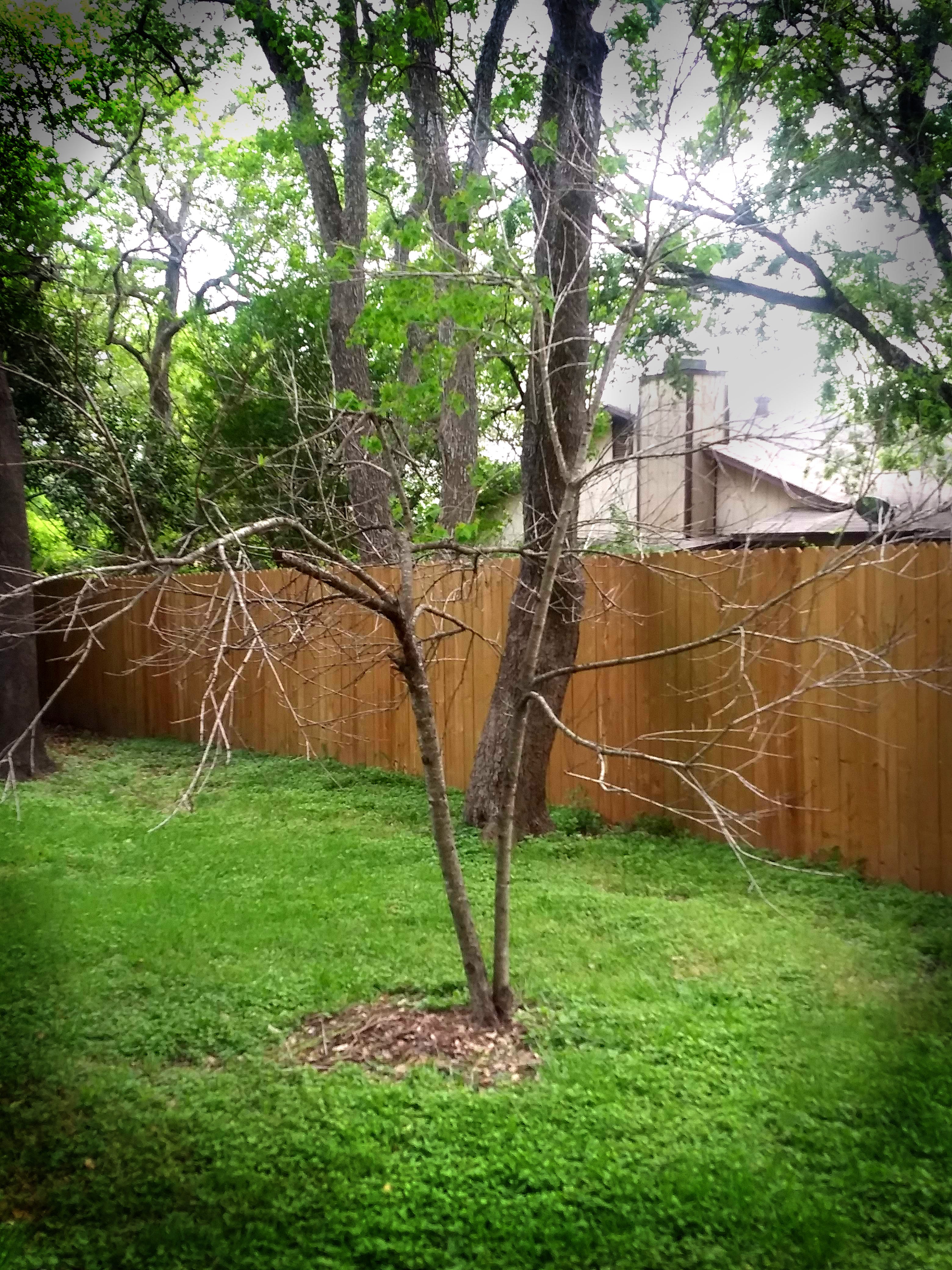 This peach tree had fruit on it when we moved into the house, and I was so excited about it. Unfortunately, the squirrels ate every single one of them. I was determined I would have fruit this coming year. I trimmed it, fertilized it, and did all the things I thought you were supposed to do.