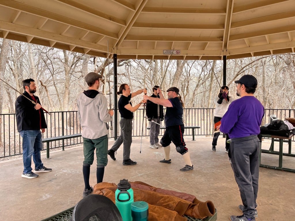 I am a member of HEMA (Historical European Martial Arts), and I was trying out historical ways of fighting in a dress that requires tying the hem up (not shown). My membership in this group has been both educational and fun. I am learning to fight with the longsword, dussack, quarterstaff, and other historical weapons. I have also been able to get help with my research.